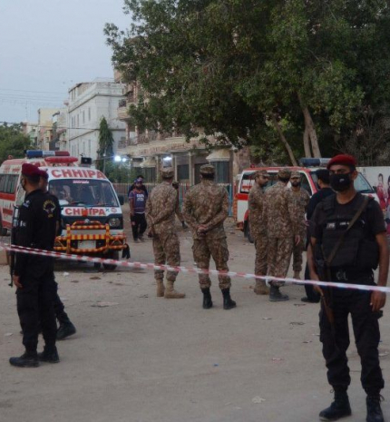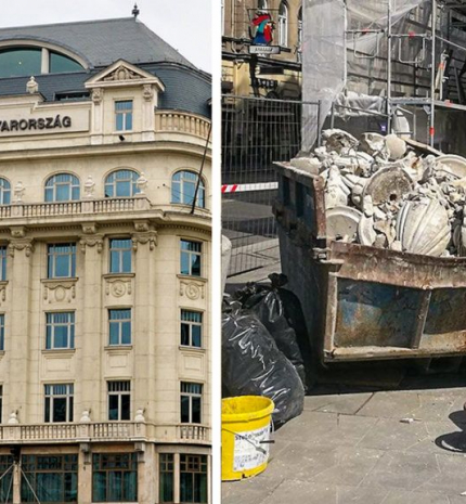 A felállványozott székház előtti konténerben jelentek meg a darabokra tört faragott kődíszek. Az épületet húsz éve újították fel, a munkákat akkor komoly szakmai díjjal is elismerték.