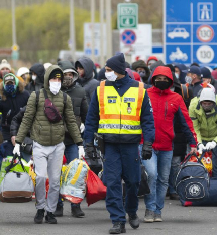Folyamatosan érkeznek buszok a vendégmunkásokkal, noha már csak autóval lehetne átlépni a határt.