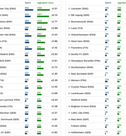A Sporttudományok Nemzetközi Központja (CIES) a legújabb kutatásában azt vizsgálta, mely klubok fektetnek be a legjobban játékosokba, vagyis mennyiért vásárolták és mennyit érnek a jelenlegi keretüket alkotó labdarúgók. A keretek jelenlegi értékét egyéni szorzószámok alapján állapították meg. Ami biztos, a Real Sociedadnál, a Betisnél, a Lille-nél és a Lyonnál is értenek ahhoz, hogyan kell csiszolatlan gyémántokat felfedezni és felfuttatni. részletek