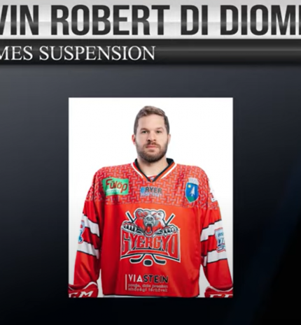 Az Erste Liga fegyelmi bizottságának tájékoztatása szerint három mérkőzésre szóló eltiltást kapott a Gyergyói HK kanadai-olasz csatára Devin Di Diomete. részletek